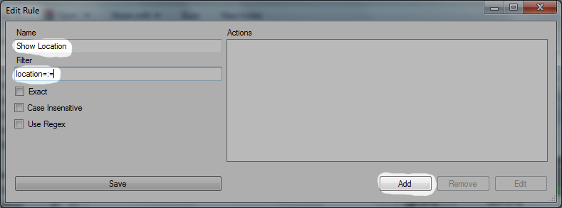• In the name write “Show Location” and in the Filter write “location=:=”. We are thus creating a rule for all received messages containg the string “location=:=”. Click the “Add” button under “Actions”.