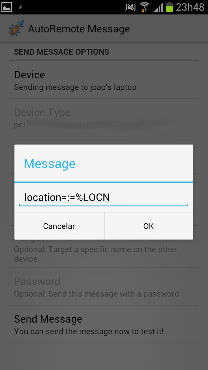 • In the Message field write “location=:=%LOCN”. This will send “location=:=” followed by your last know Network Location.